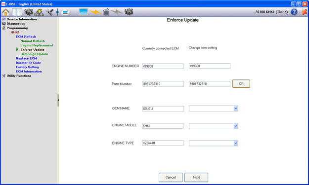 For the Enforce Reflash mode, the current ECM Part Number information will be displayed on the left side of the screen and the Part Number information for the ECM you want to create can be input on the right side of the screen.