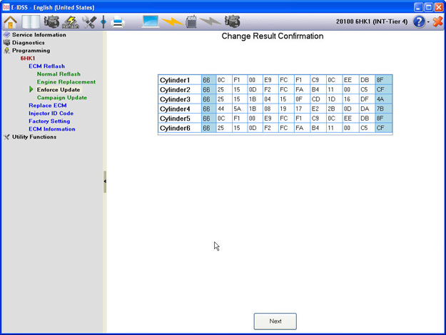 After the Injector ID code setting is performed, the current Injector ID data will be displayed.  Select the “Next” button to exit Replace ECM and return to the Programming main menu.