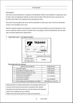 Заводская инструкция по ремонту крана Тадано - Tadano Rough Terrain Crane GR-900XL-3, GR-1000XL-3 содержит подробную информацию о сборке и разборке агрегатов, процедур диагностики, электрические схемы, моменты затяжек и др.